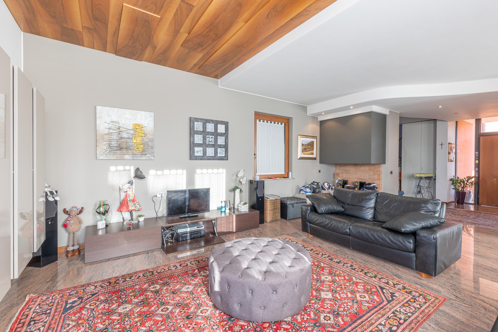 Dal soggiorno cinque scalini ci conducono alla TAVERNA con camino di generose dimensioni, la quale si affaccia DIRETTAMENTE SUL GIARDINO dove è possibile predisporre una piscina interrata.