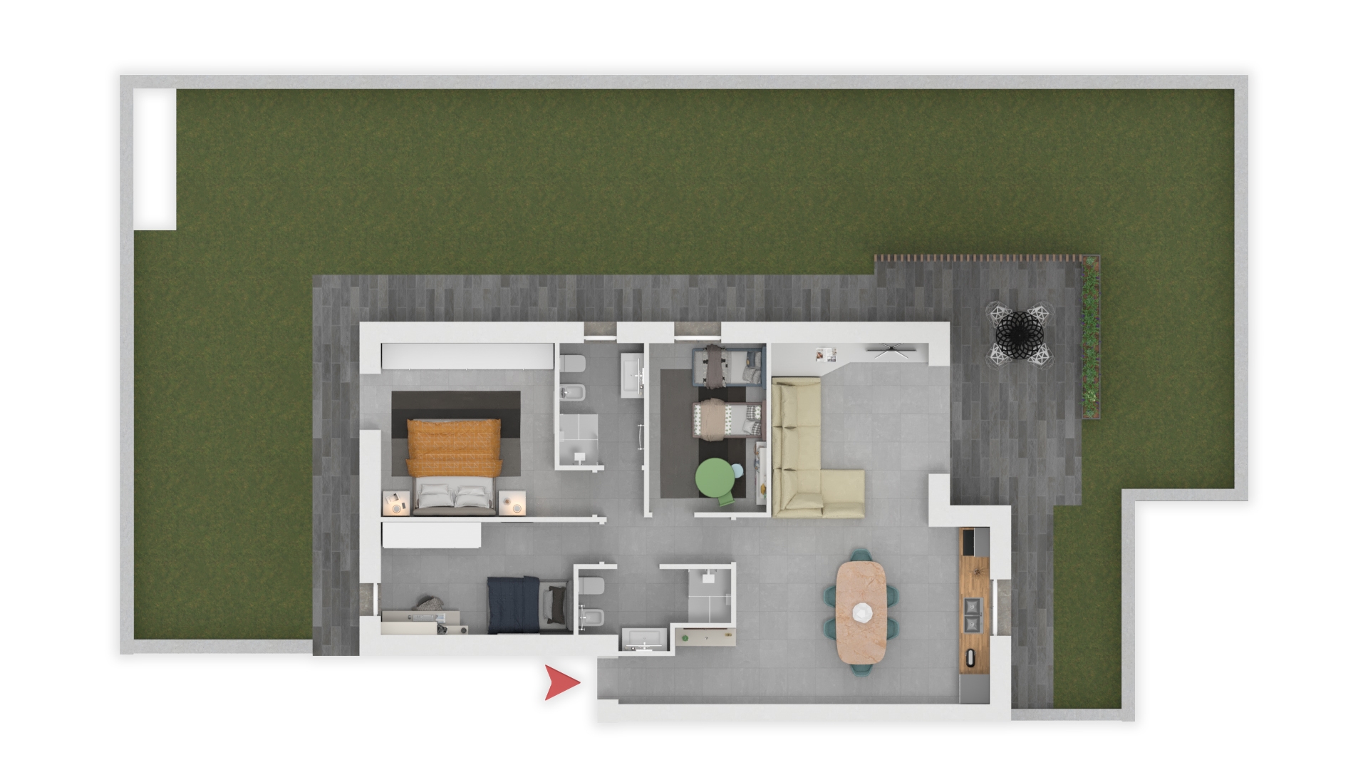 In entrambi i casi e possibile scegliere la soluzione o con giardino privato angolare o con terrazzo abitabile.