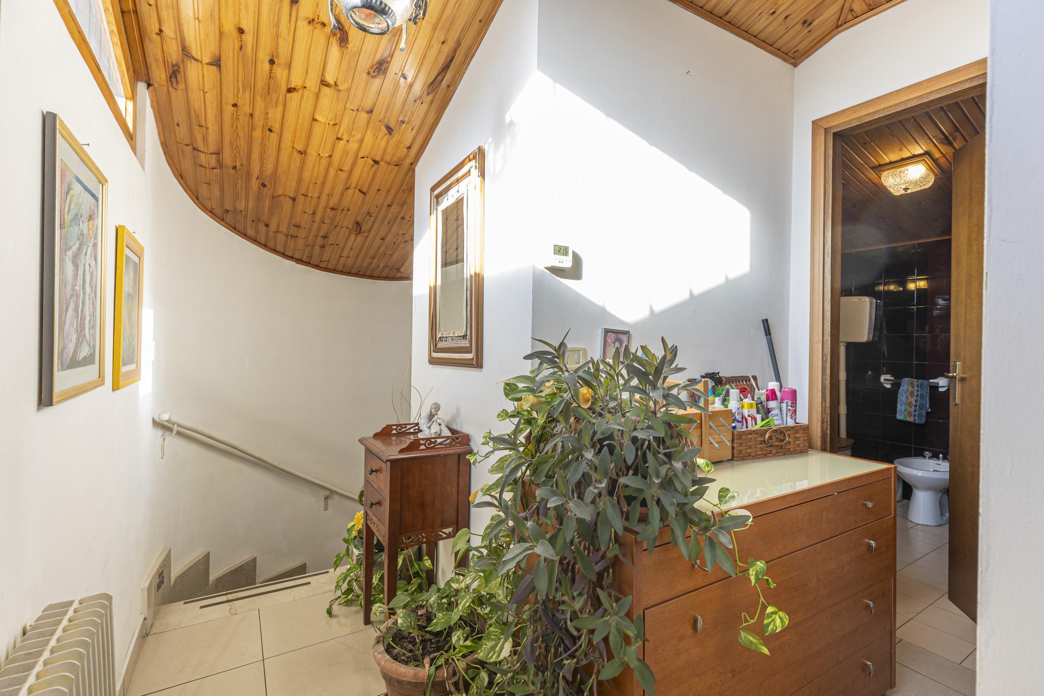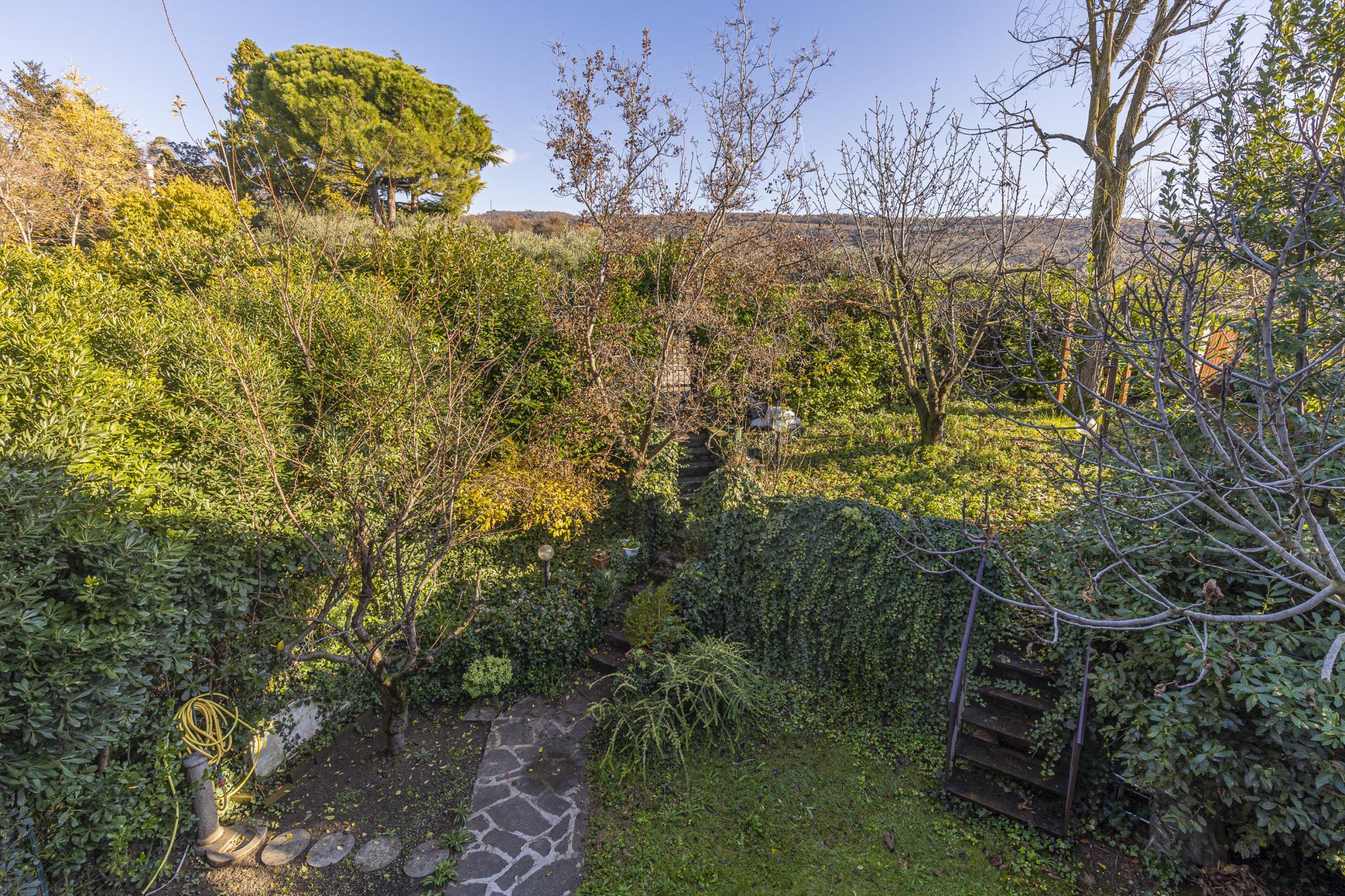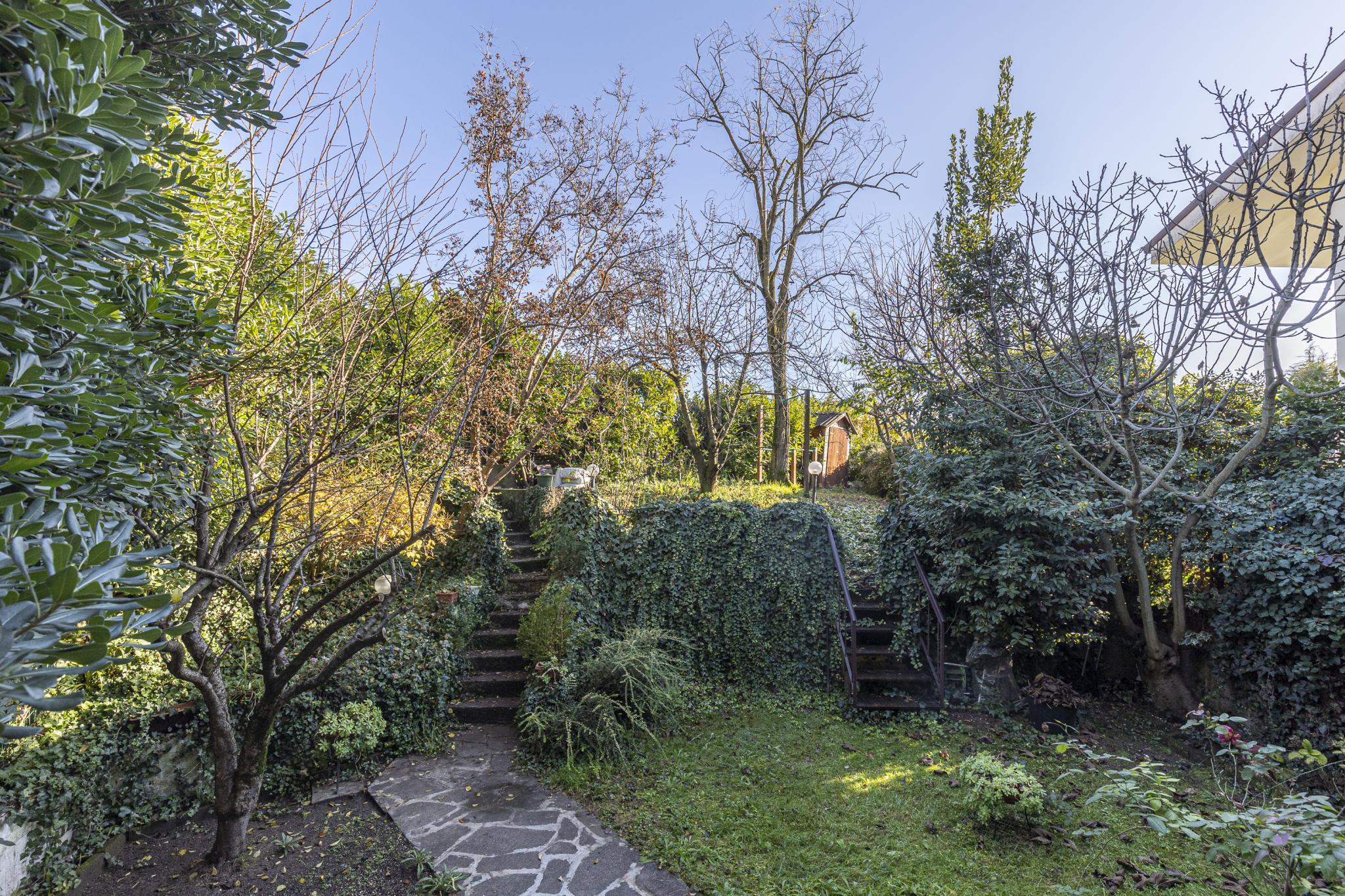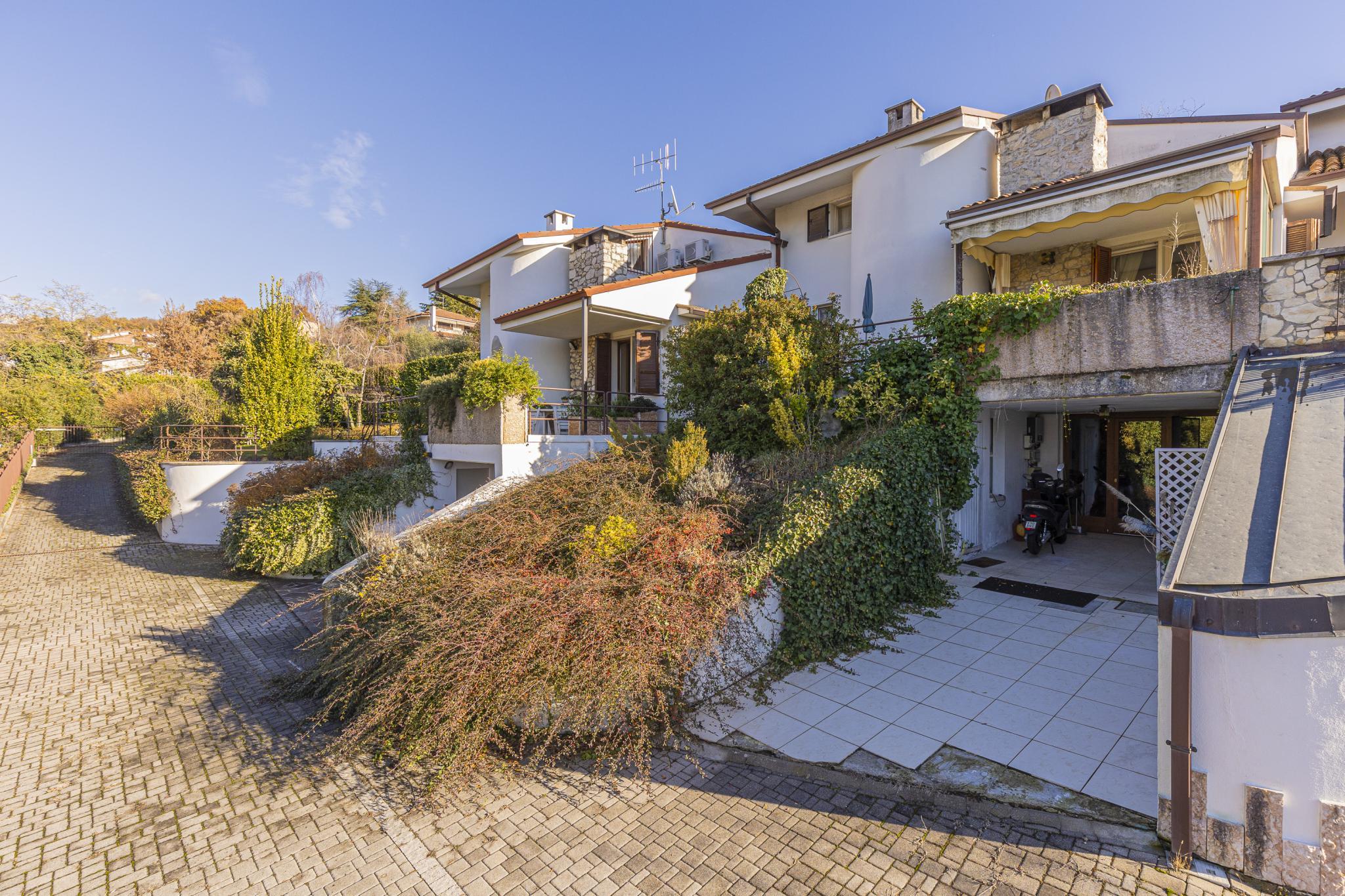 La casa, posta sui piani terra, primo e seminterrato, offre indipendenza con l'accesso pedonale privato componendosi da ingresso, soggiorno con camino, cucinotto a vista, due bagni, due vani letto matrimoniali, un vano letto singolo o studio, cantina con predisposizione wc, garage (attualmente adibito a zona studio/living), ripostiglio esterno (ideale per riporre attrezzatura per il giardino), posti auto di cui uno coperto, terrazza con veduta panoramica e giardino privato.