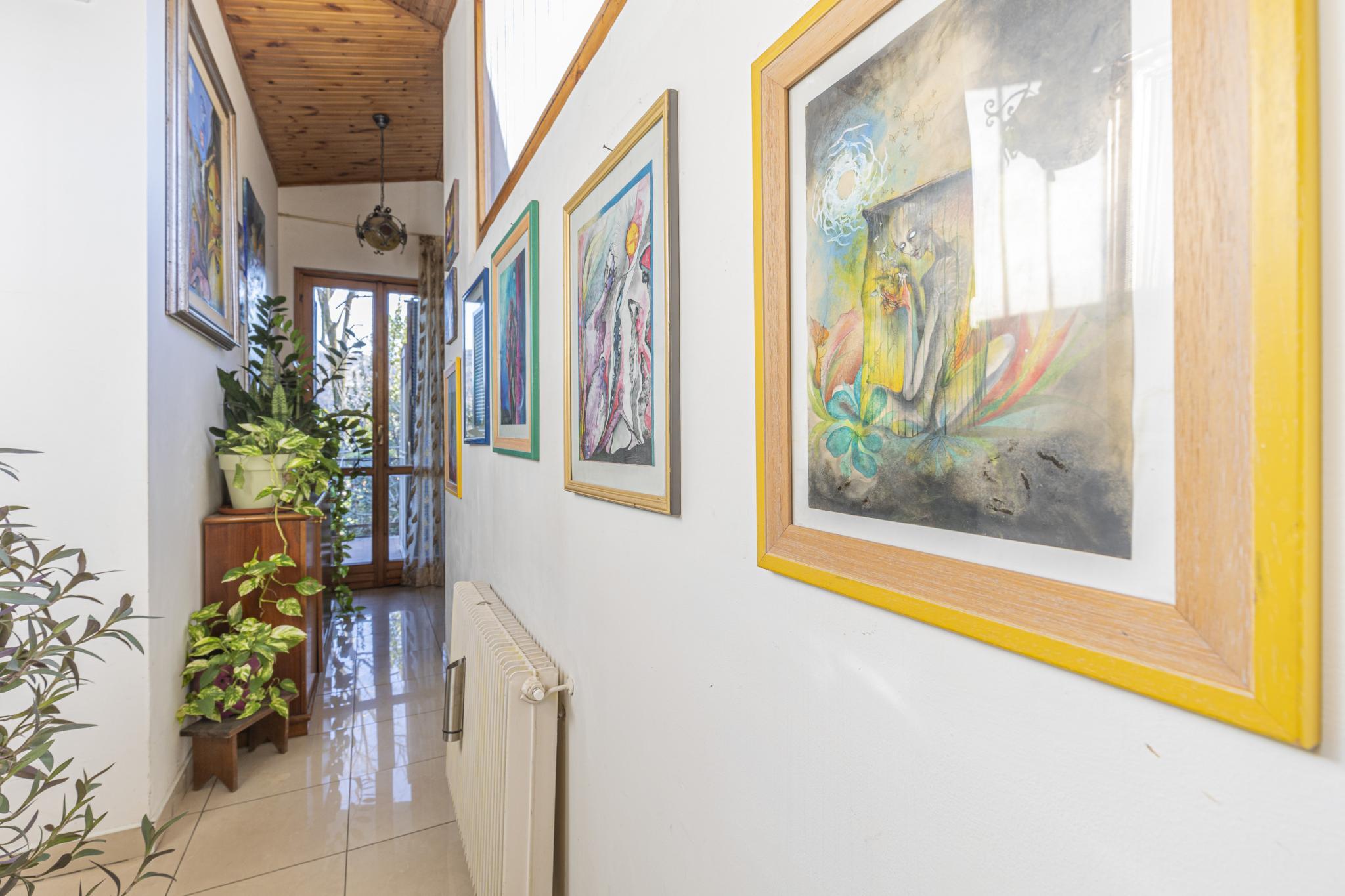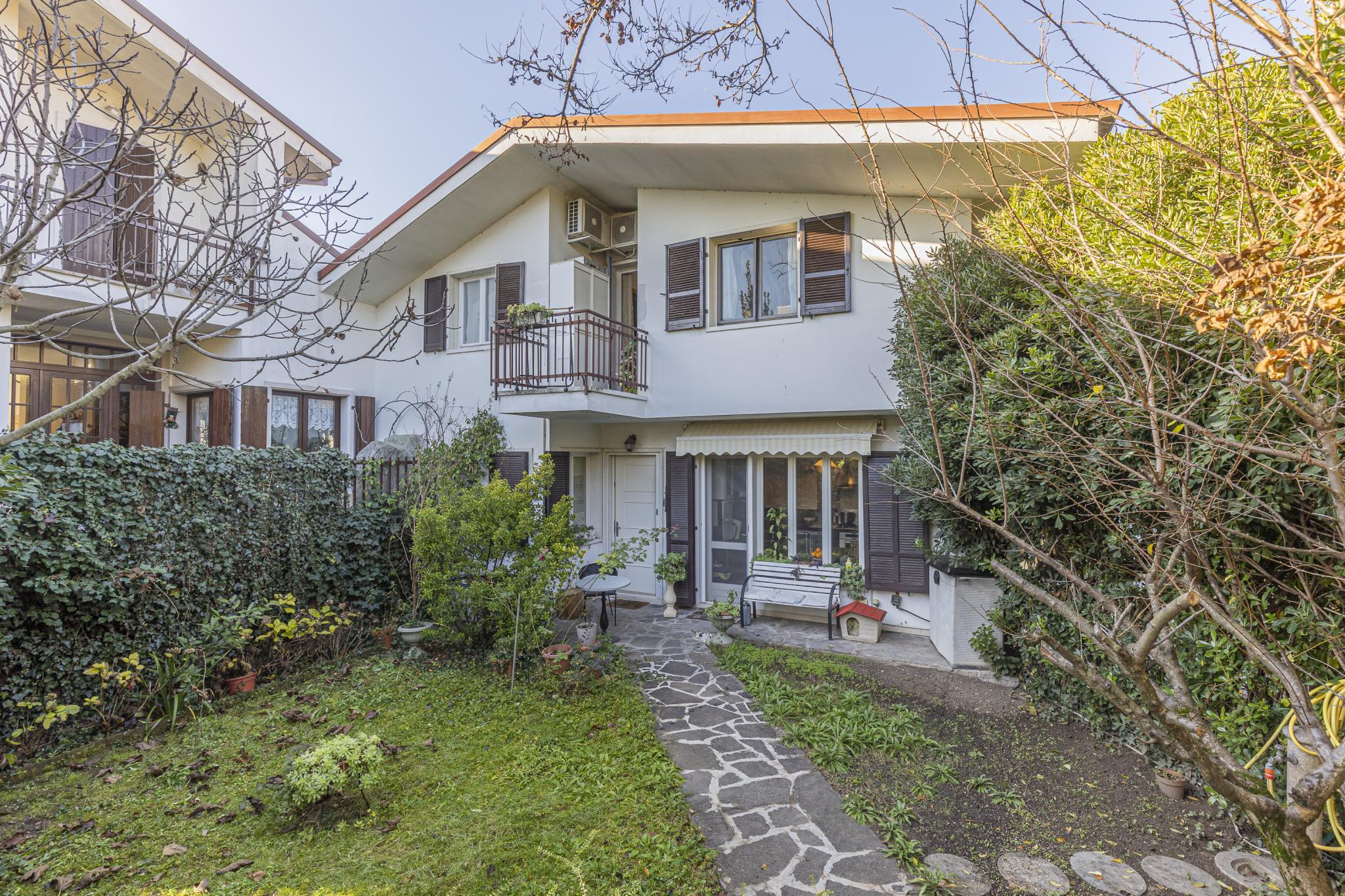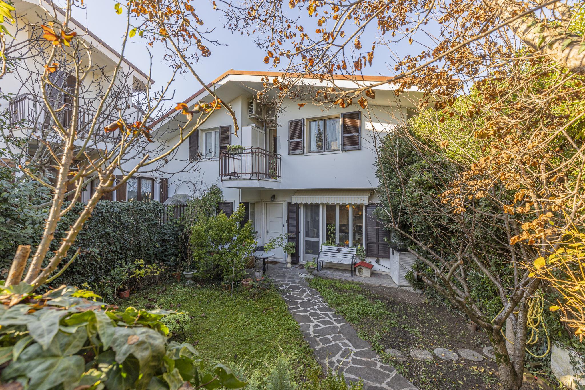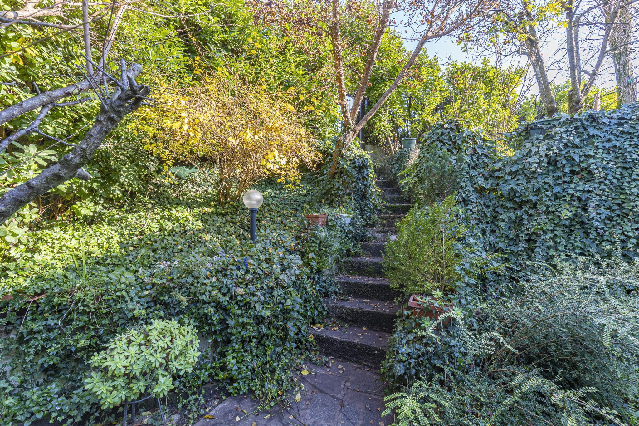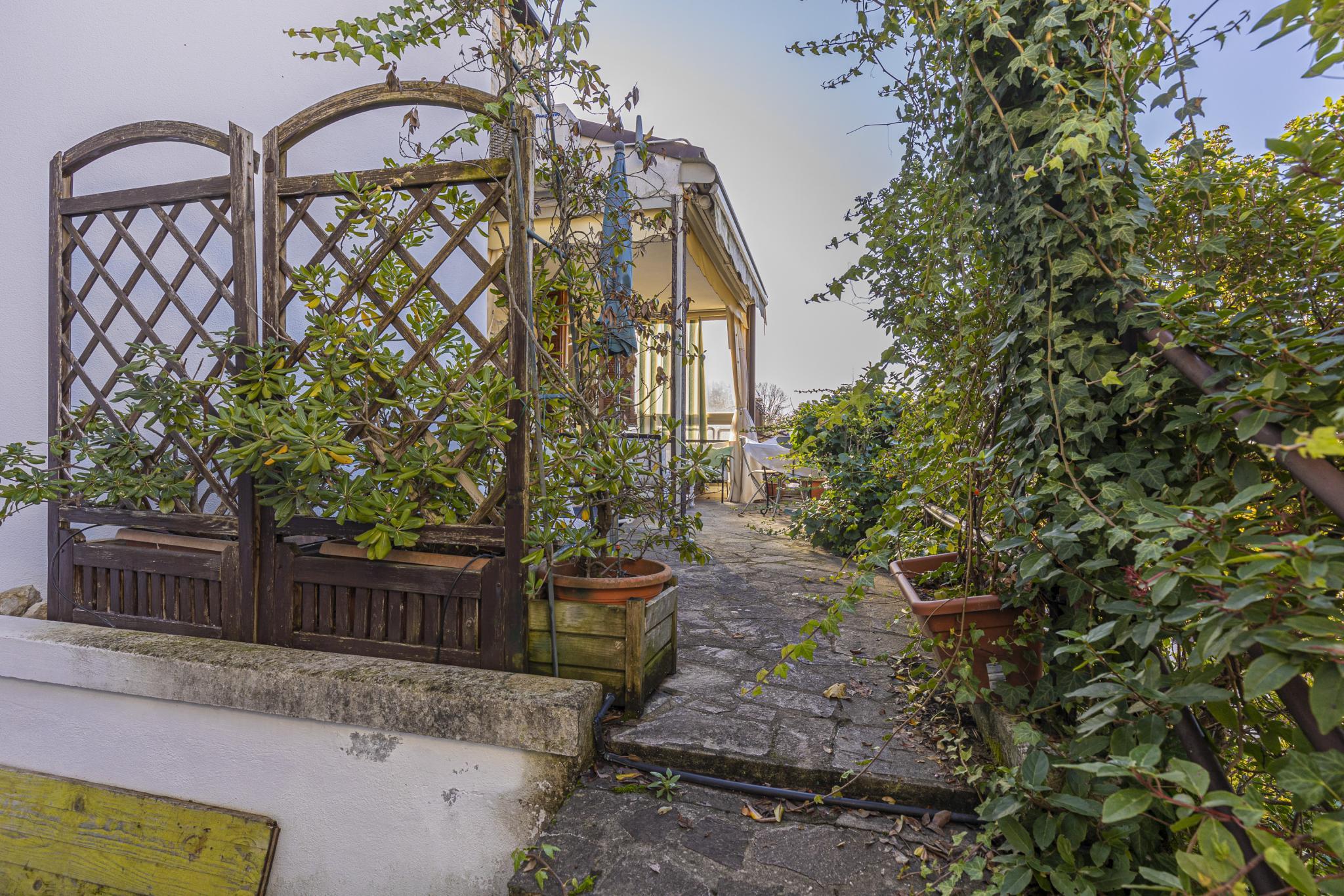 La casa, posta sui piani terra, primo e seminterrato, offre indipendenza con l'accesso pedonale privato componendosi da ingresso, soggiorno con camino, cucinotto a vista, due bagni, due vani letto matrimoniali, un vano letto singolo o studio, cantina con predisposizione wc, garage (attualmente adibito a zona studio/living), ripostiglio esterno (ideale per riporre attrezzatura per il giardino), posti auto di cui uno coperto, terrazza con veduta panoramica e giardino privato.