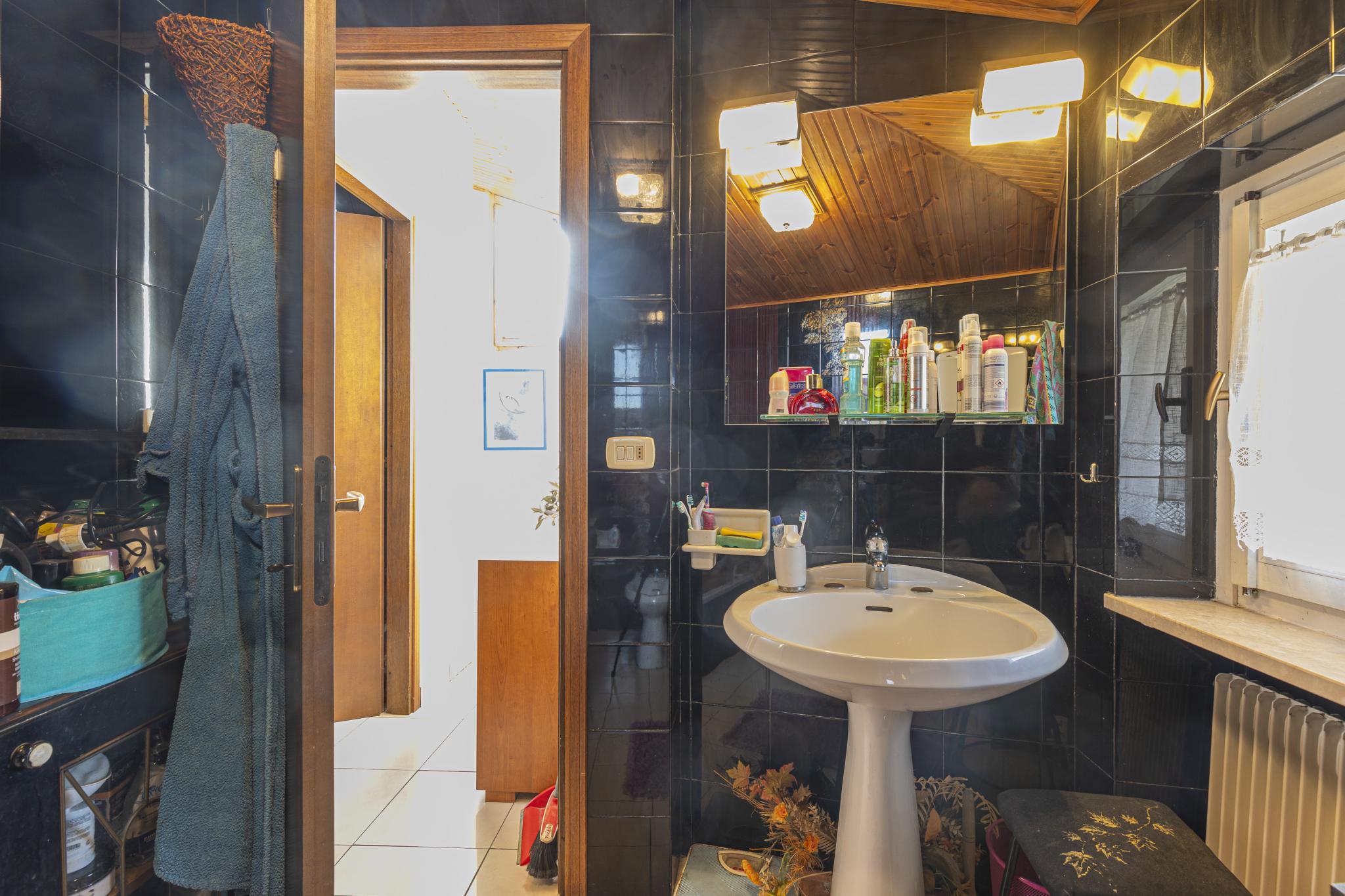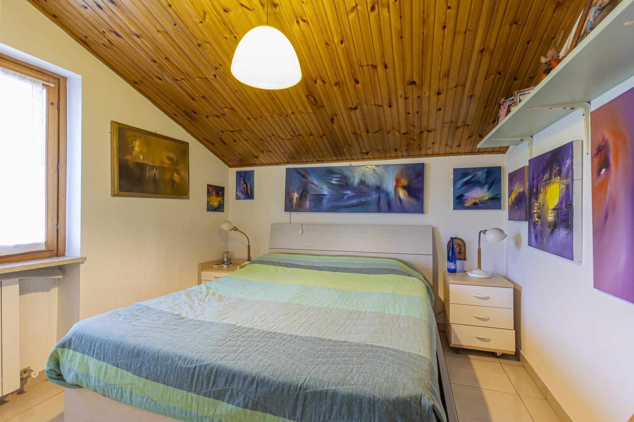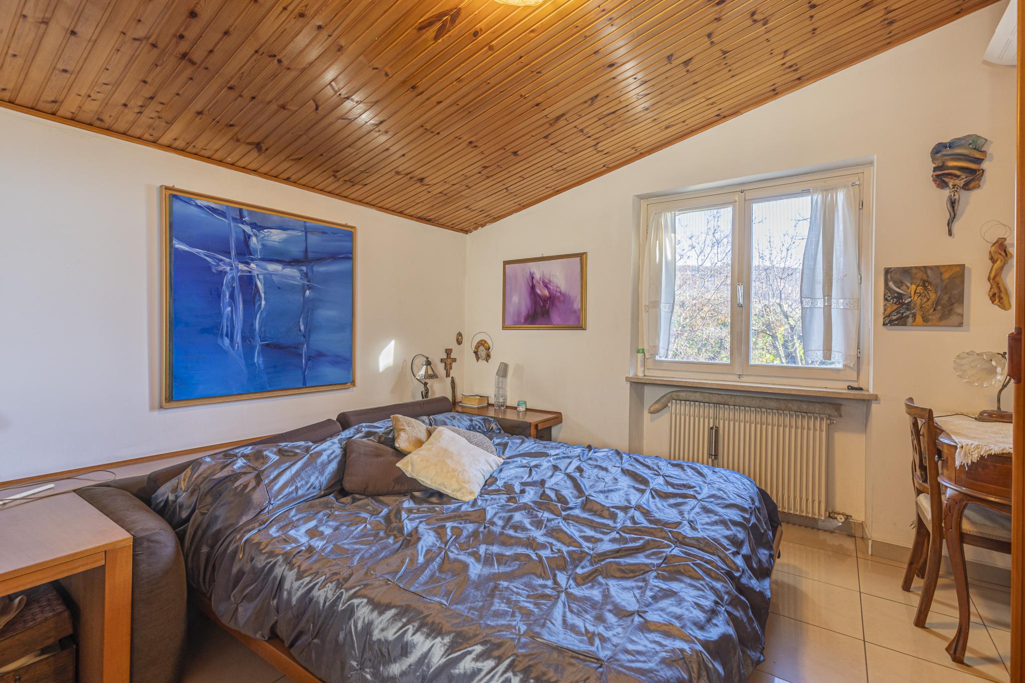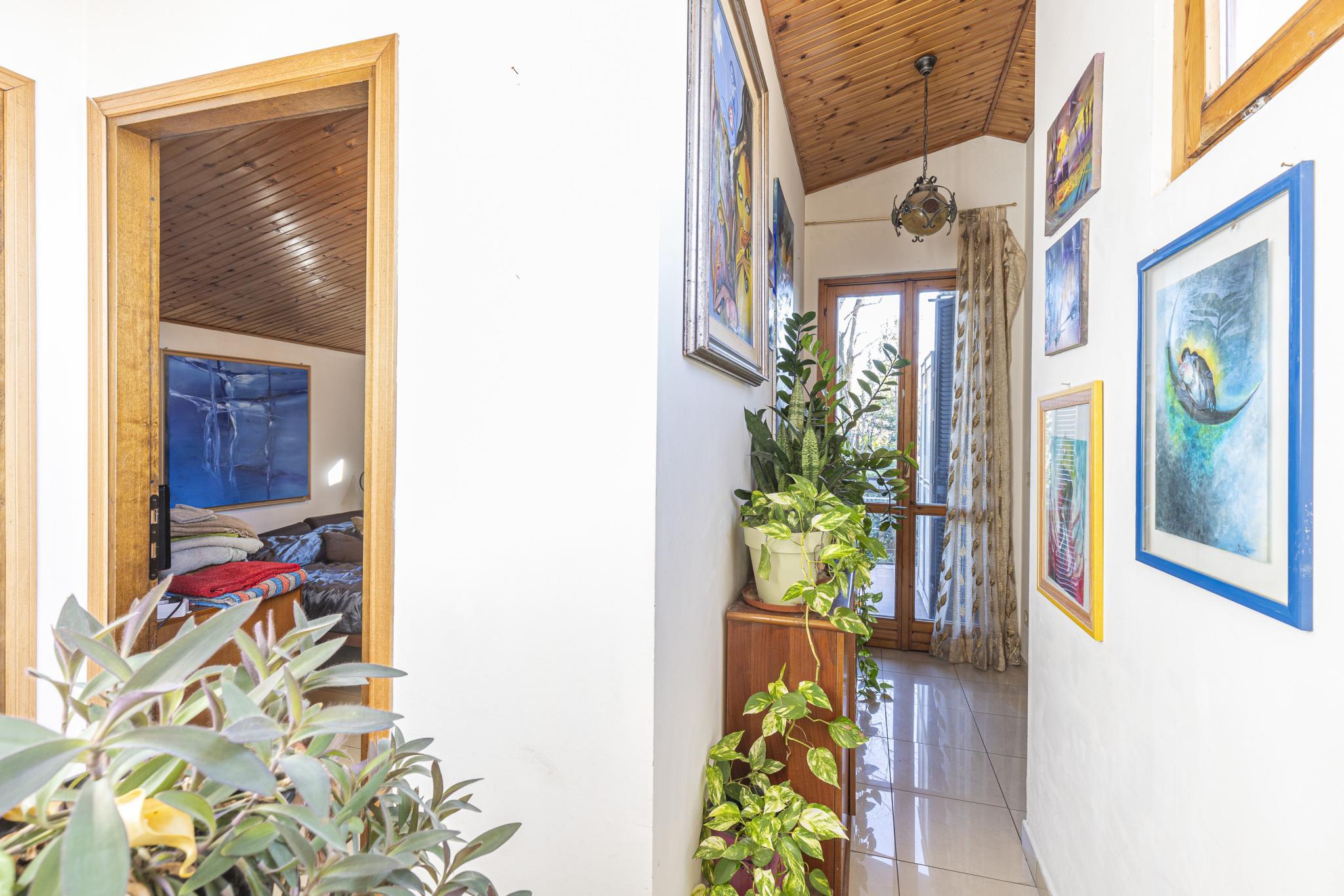 La casa, posta sui piani terra, primo e seminterrato, offre indipendenza con l'accesso pedonale privato componendosi da ingresso, soggiorno con camino, cucinotto a vista, due bagni, due vani letto matrimoniali, un vano letto singolo o studio, cantina con predisposizione wc, garage (attualmente adibito a zona studio/living), ripostiglio esterno (ideale per riporre attrezzatura per il giardino), posti auto di cui uno coperto, terrazza con veduta panoramica e giardino privato.